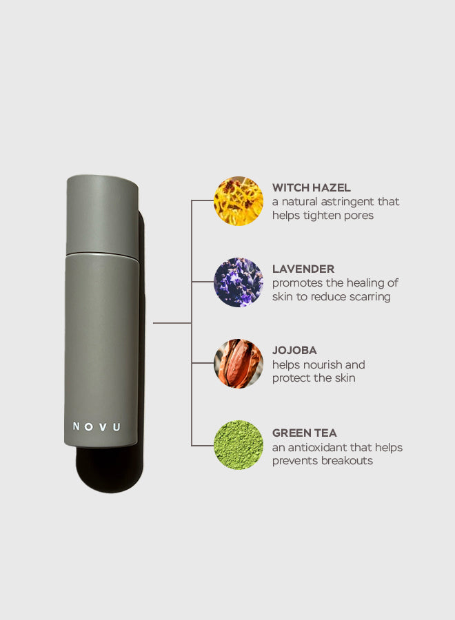 Made with: witch hazel, lavender, jojoba, green tea extract